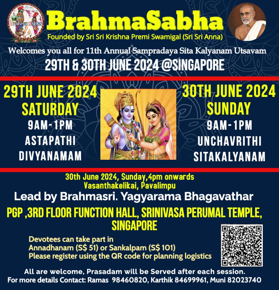 Brahma Sabha Singapore is happy to invite all Singapore living people to our annual Sitakalyanam which will be held on June 29th and June 30th 2024 at PGP Function hall, Sri Srinivasa Perumal temple, Serangoon Road, Singapore.