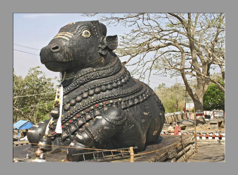 The Chamundi temple has always been patronised by the rulers of Mysore. In 1659 Dodda Devaraja Wodeyar built 1,000 steps and big Nandi, Lord Shiva's Bull. This gigantic Nandi is likely one of the largest within India, 16 ft. (4.8 meters) tall in the front and 25 ft. (7.5 meters) in length. The magnificent pendent bells around its neckline are exquisite. Nandi as well as the temple beside it can be found at the 700th step of the Chamundi Hill.