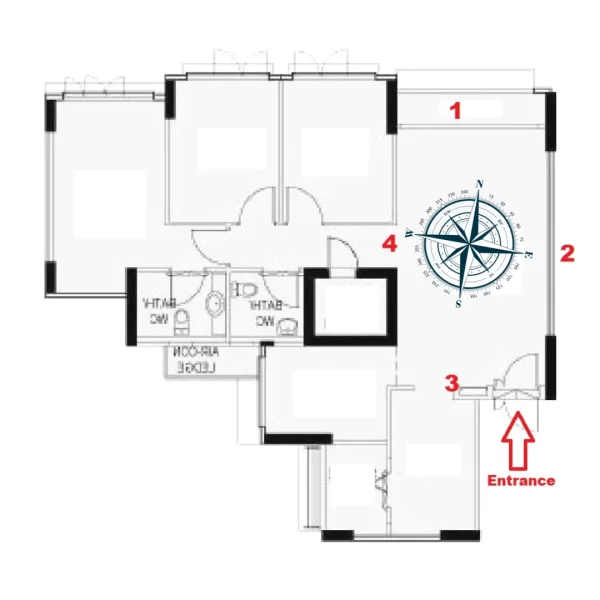 To better understand this, I tried placing a compass on a house layout and marked the walls with numbers 1, 2, 3, and 4. I also marked the entrance for reference.
