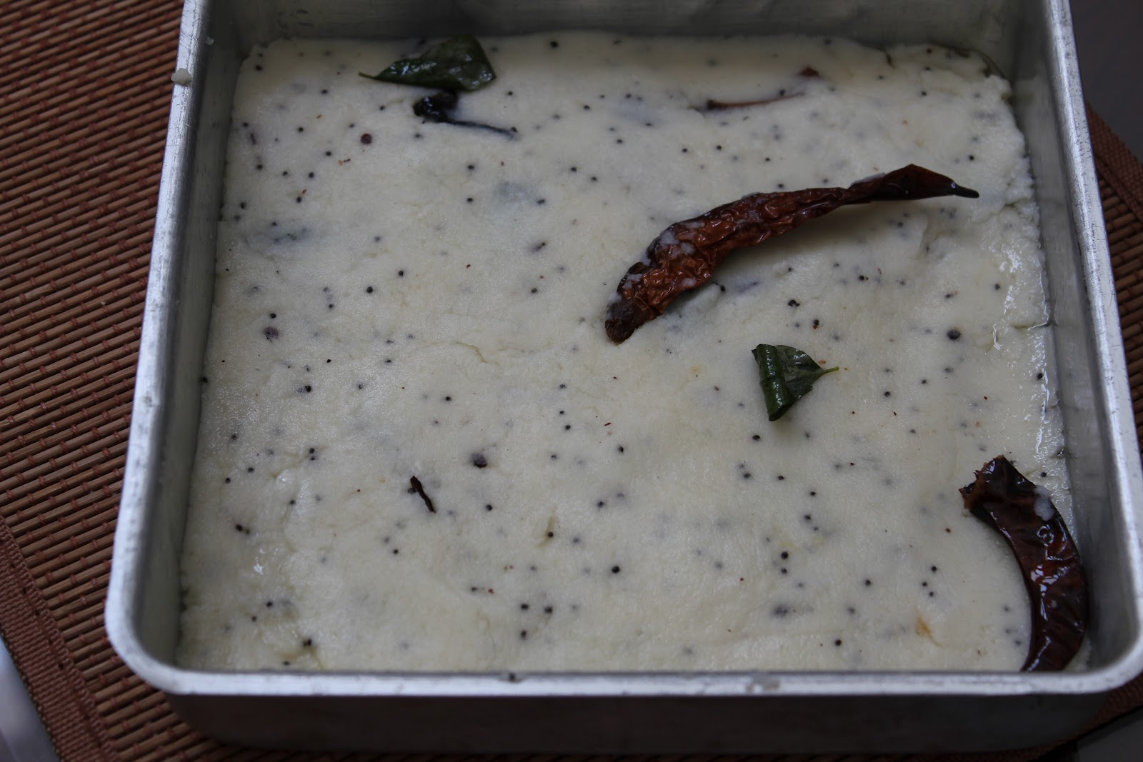 - Whisk rice flour,salt and buttermilk into a smooth batter in a pouring consistency(add about two cups of water to the buttermilk).Grease a flat tray or plate with gingelly oil and keep it aside.