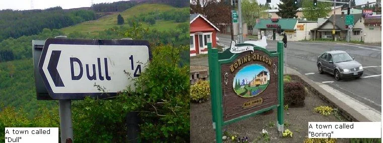 That's what happened when two small towns, one in the U.S. state of Oregon and the other in Scotland, decided to get together and become sister communities. Boring (Oregon, USA) with a population of 8,000, is named after William H. Boring, a homesteader. Dull (Scotland) has a population of 84 and the name is from a Gaelic word meaning meadow. The partnership is just for fun, but both communities hope to make the most of the publicity. The towns can use their collectively descriptive names to promote tourism. Community leaders in Boring plan to sell T-shirts that say "Boring and Dull," and even have a tagline for the partnership: "Boring and Dull: A Pair for the Ages."