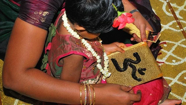 The ritual of Vidyarambham introduces young children into the world of knowledge, letters, and the process of learning.
